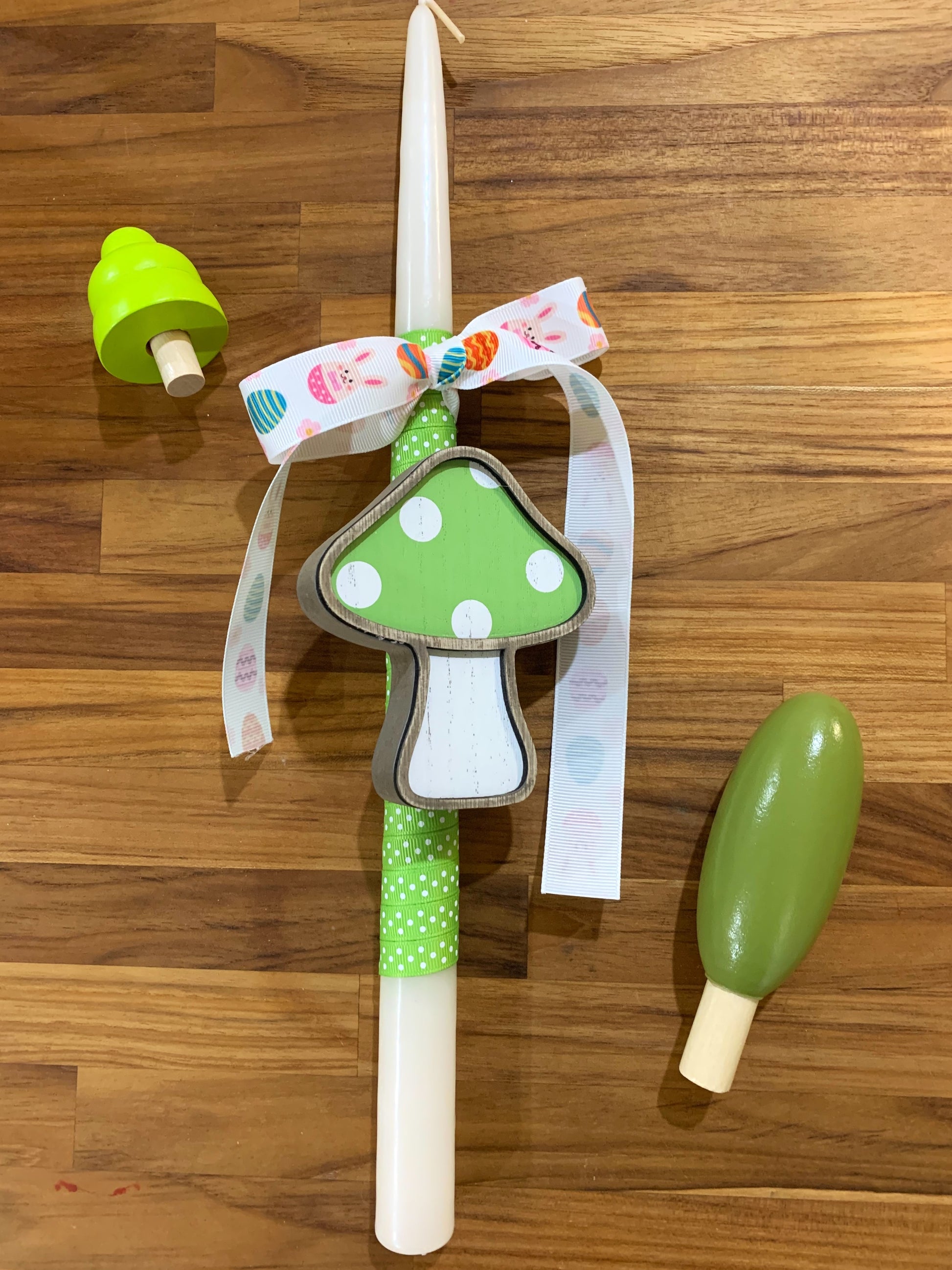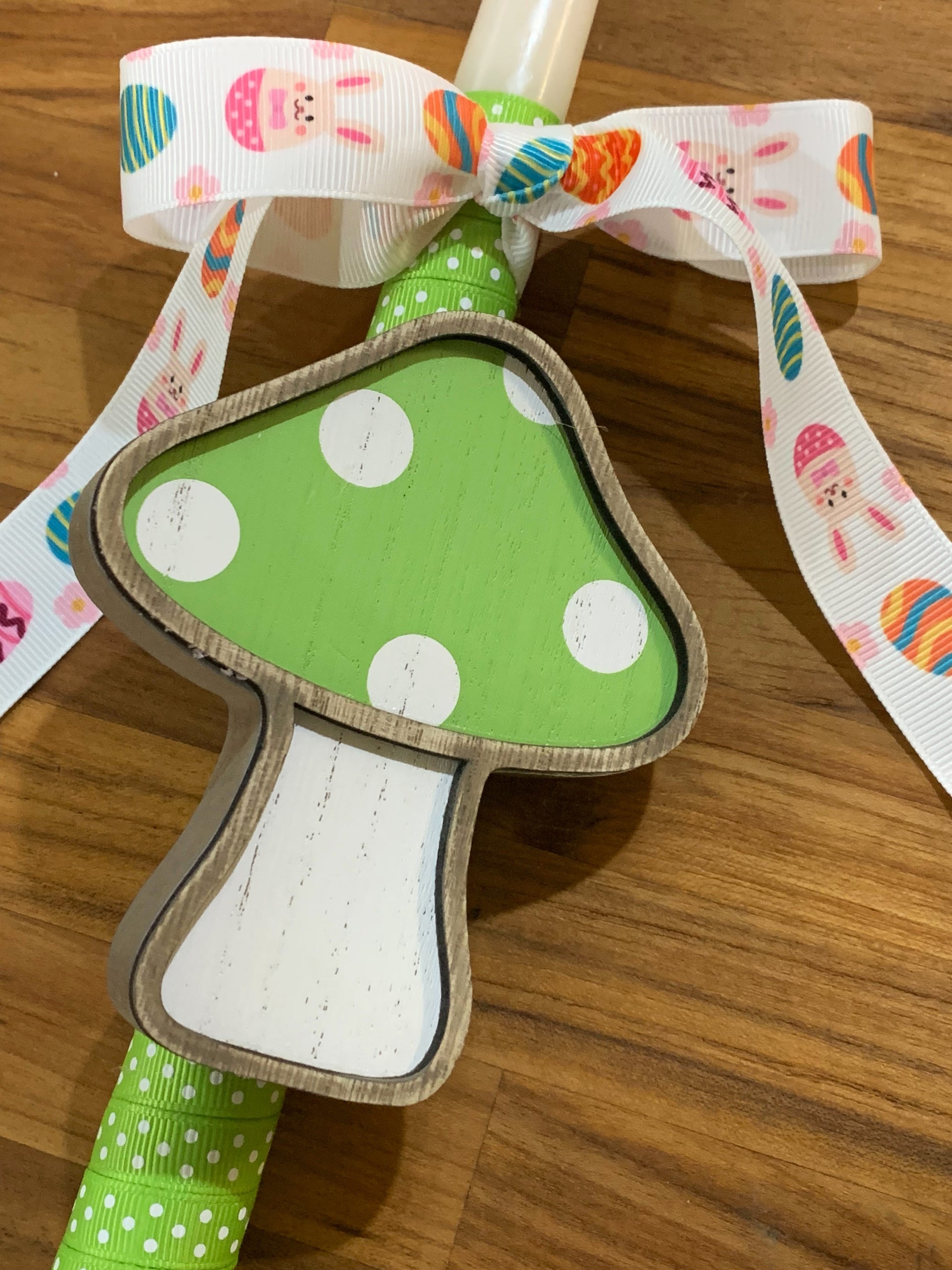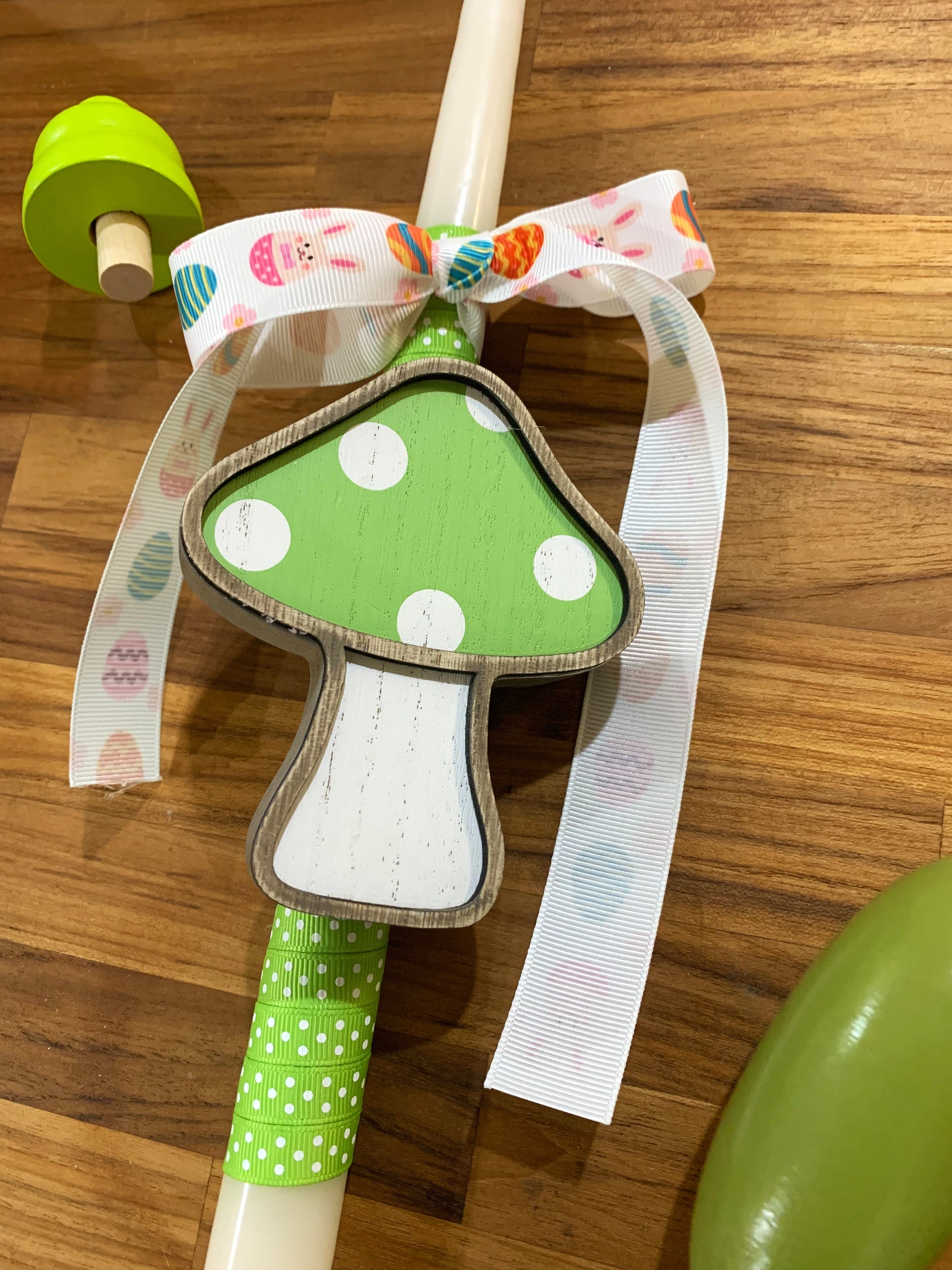 White Easter candle with wooden, green and white polka dots mushroom on a same pattern ribbon and a bow with Easter ribbon with bunnies and eggs.